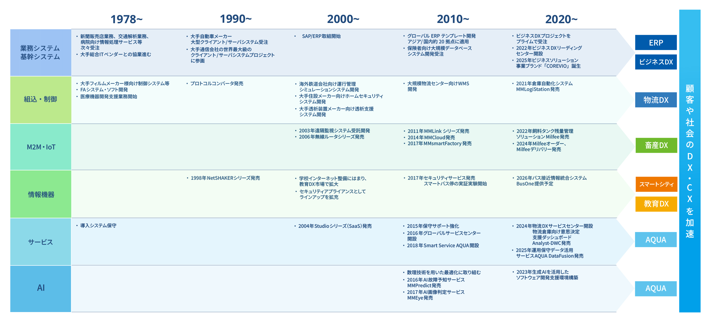 当社は、株式会社安川電機のIT部門が分離独立して設立した企業で、製造業向けの生産管理システムなどの業務システムや、モーターやロボットを制御するシステムなどをコア技術として、製造業での長年の経験から蓄積された技術とノウハウを駆使してさまざまな事業分野へと拡がり、ITやニーズの変化とともに当社のコア技術を進化・マッチさせてきました。