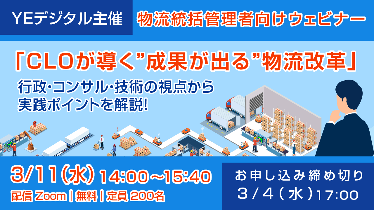 株式会社YE DIGITAL(本社:北九州市小倉北区、代表取締役社長:玉井裕治、以下、YEデジタル)は、物流DX推進のキーマンであるCLO(物流統括管理者)を対象に、行政・コンサル・技術の3視点から学ぶウェビナー「物流統括管理者(CLO)が導く”成果が出る”物流改革」を、2026年3月11日(水)に開催します。