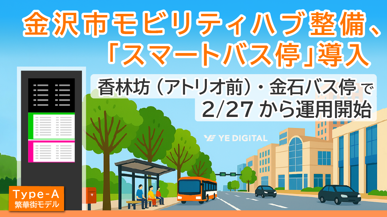 株式会社YE DIGITAL(※1、以下 YEデジタル)が提供し、株式会社ホクリクコム(※2、以下 ホクリクコム)が販売する「スマートバス停」が、この度、石川県金沢市(以下、金沢市)による金沢版モビリティハブ整備事業の一環として導入され、2026年2月27日(金)より香林坊(アトリオ前)バス停(屋外3基・屋内1基)および金石バス停(屋内1基)にて計5基の運用を開始します。