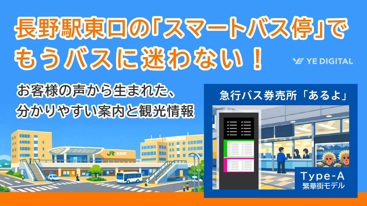 株式会社YE DIGITAL(本社:北九州市小倉北区、代表取締役社長:玉井裕治、以下、YEデジタル)が提供する「スマートバス停」が、長電バス株式会社(本社:長野県長野市、代表取締役:鈴木立彦、以下、長電バス)により導入され、2025年12月6日(土)より長野駅東口・急行バス券売所「あるよ」にて運用されています。お客様から「案内が分かりやすく目的地へのバスを迷わず選べるようになった」などの声が寄せられ、利便性の向上や混雑緩和の効果を実感いただいています。