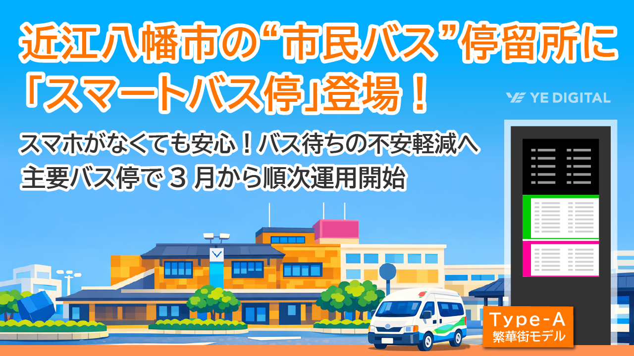 株式会社YE DIGITAL(※1、以下 YEデジタル)が提供し、アーティサン株式会社(※2、以下 アーティサン)が販売する「スマートバス停」が、滋賀県近江八幡市(以下、近江八幡市)に採用され、同市が運行する『あかこんバス』(市民バス)の主要停留所である近江八幡駅北口バス停、市役所(屋内・屋外)、市立総合医療センターの3カ所に、計4基設置されます。2026年3月から順次運用を開始し、市役所(屋外)については今夏の運用開始を予定しています。