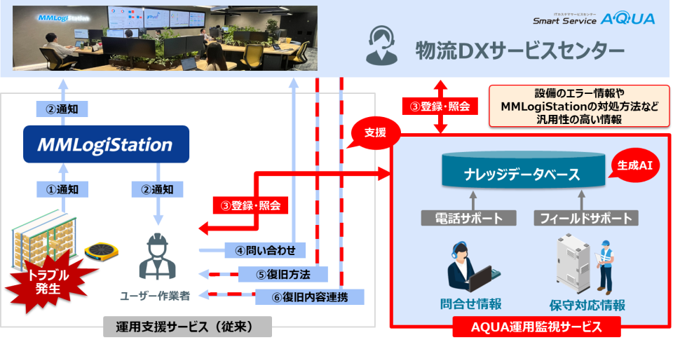 ユーザー固有のインシデント情報だけでなく、収集した自動化設備のエラー情報や「MMLogiStation」の対処方法に関する情報から物流DXセンターがナレッジ化を行い、それを活用したサポートを提供します。